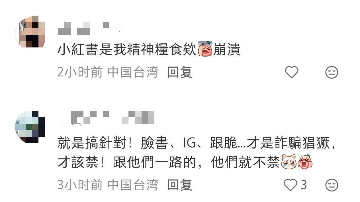 还有多名台湾网友将小红书比作“精神食粮”,他们表示,周边的年轻人都在用这款软件,之后即使被封禁了,也会另想办法继续使用的。
